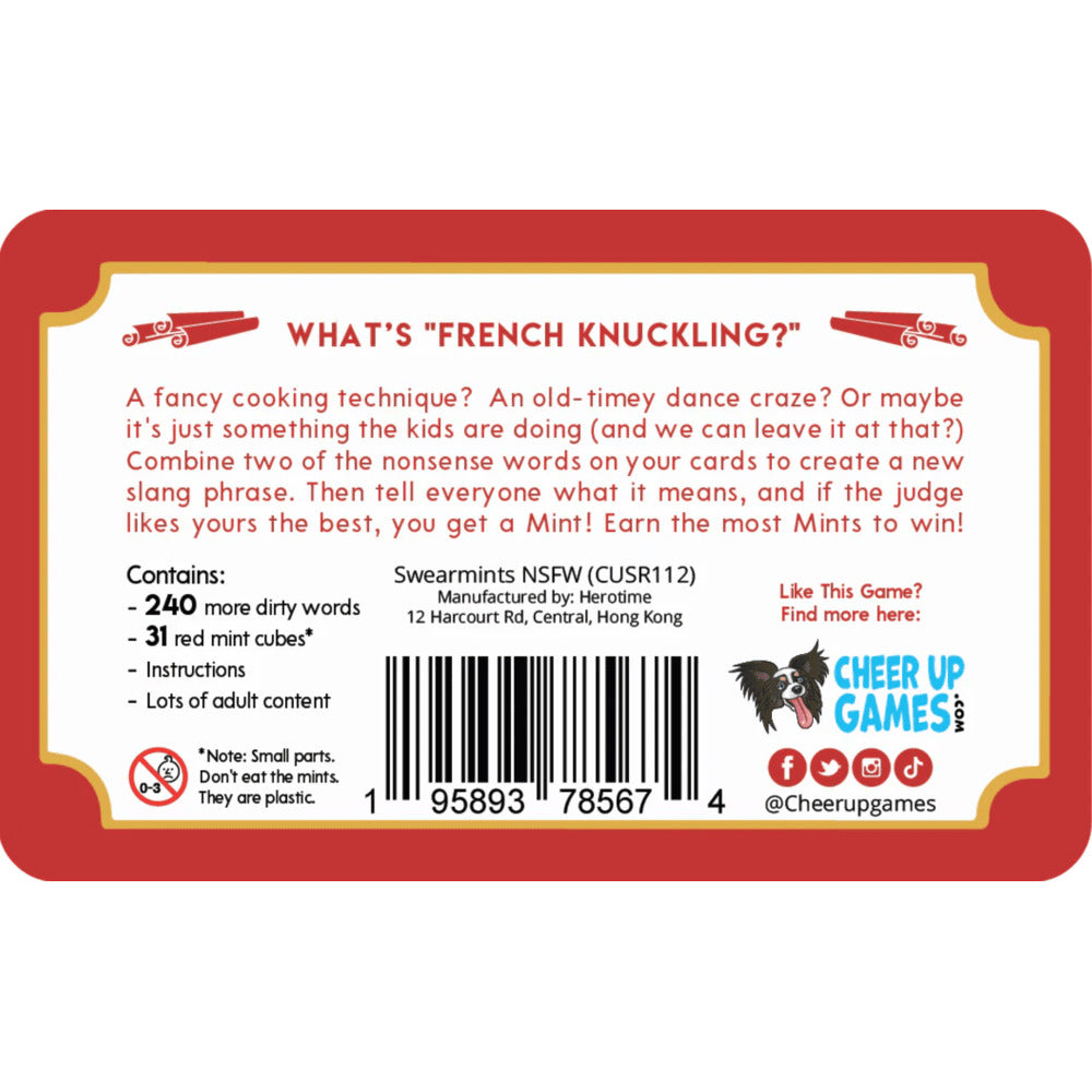 Recommended Ages: 17+Swearmints Spicy NSFW Edition is (possibly) the world's most portable ADULT party game, all about making up your own swears! Featured on Smosh (twice!) and with millions of views on TikTok, you'll easily see why this little game has gone viral multiple times!