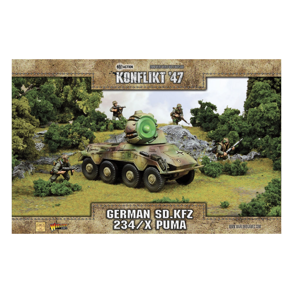 - 1 plastic, resin & metal German Sd.Kfz 234/X Puma suitable for Konflikt ‘47 German Army.