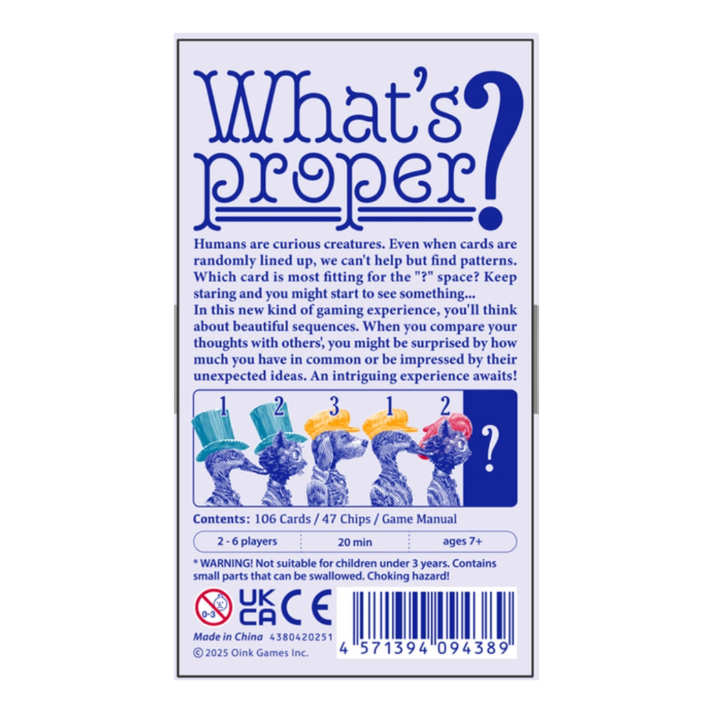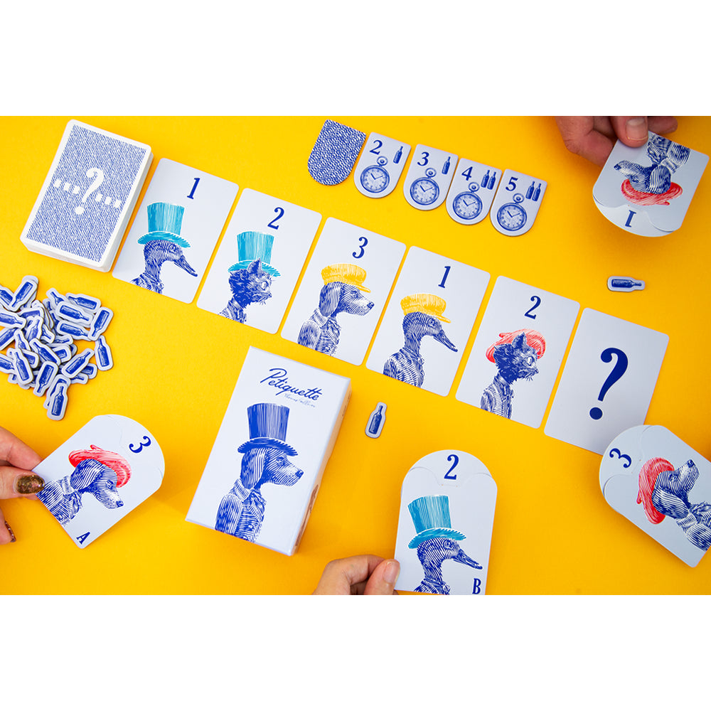 "Petiquette" is a fresh, new kind of game played with cards with combinations of three animals, three hats, and five numbers. Players look at a lineup of five randomly placed cards and try to find some logic or pattern within them. Then they choose which card would most properly fit into that pattern. For example, if the sequence is “red, red, yellow...” you might feel that yellow should come next. If it’s “dog, cat, bird…” then maybe dog again feels right. But there’s no single correct answer. If someone else chooses the same card as you, you'll earn points.
