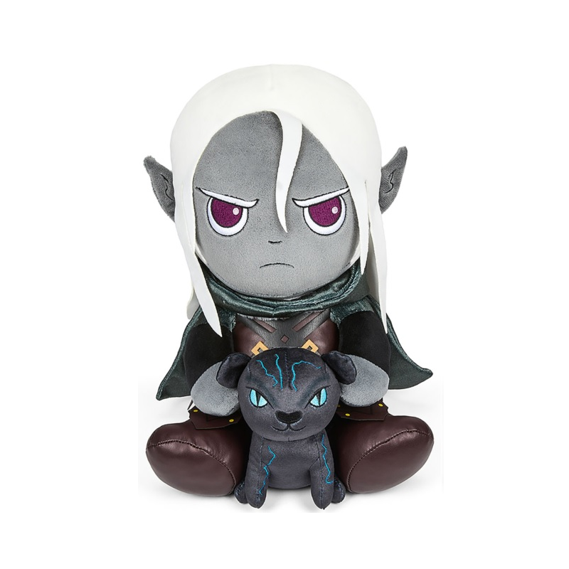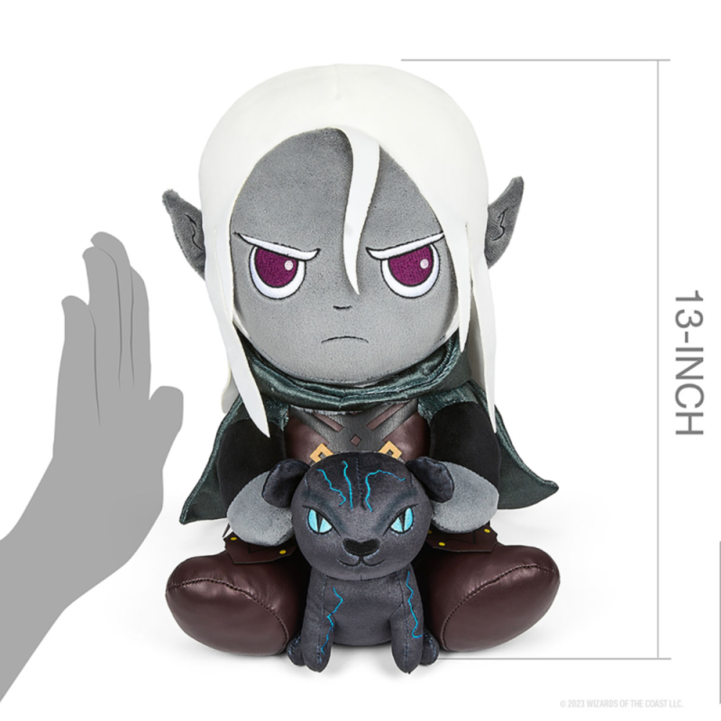 You’ve seen a number of iconic D&D creatures rendered in cuddly plush, but now you can own a cuddly companion of one of the Forgotten Realms’ most iconic heroes! Drizzt, the drow ranger, is a formidable force for good in northern Faerûn; his plush form even wears his iconic fur-brimmed green cloak that he rarely leaves home without! Drizzt is also accompanied by his own plush pet in the form of his beast companion Guenhwyvar, the black panther who is summoned by his Figurine of Wonderous Power. With this plush at your side, you will be sure to go on some fantastic adventures and you will be in great company while you do so! This plush is one of many offerings to celebrate the 35th Anniversary of Drizzt—it sits at 13 inches tall and is made with the softest premium materials and love.