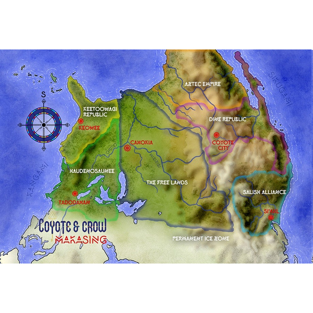 Coyote and Crow is a tabletop role playing game set in an alternate future of the Americas where colonization never occurred. Instead, advanced civilizations arose over hundreds of years after a massive climate disaster changed the history of the planet. You'll play as adventurers starting out in the city of Cahokia, a bustling, diverse metropolis along the Mississippi River. It's a world of science and spirituality where the future of technology and legends of the past will collide.