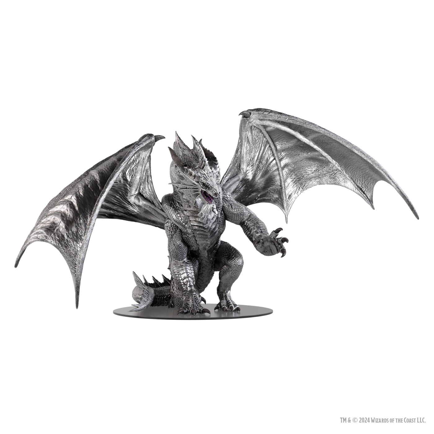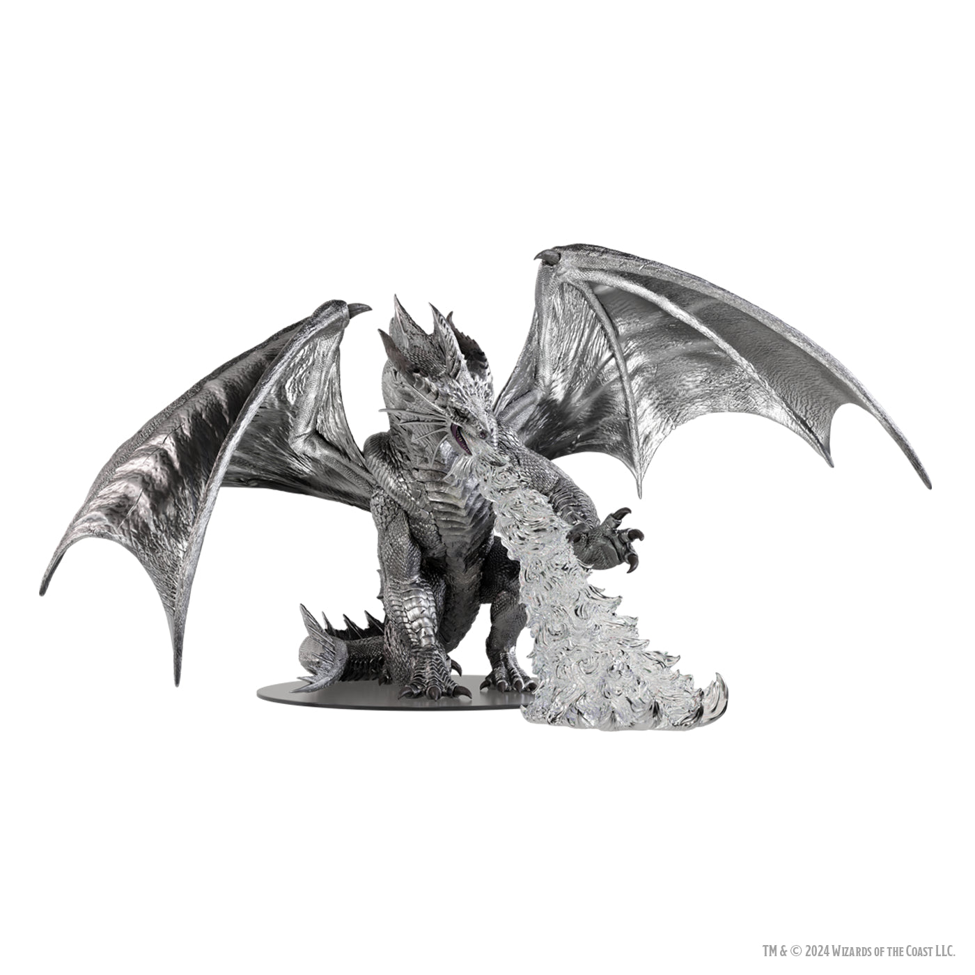 Bahamut, the patron and progenitor of metallic dragons, displays his full glory as the Platinum Dragon, towering over most dragons. Sitting at over 10 inches tall with a wingspan of 19 inches, Bahamut is ready to wreak monumental destruction with his Platinum Fire breath.