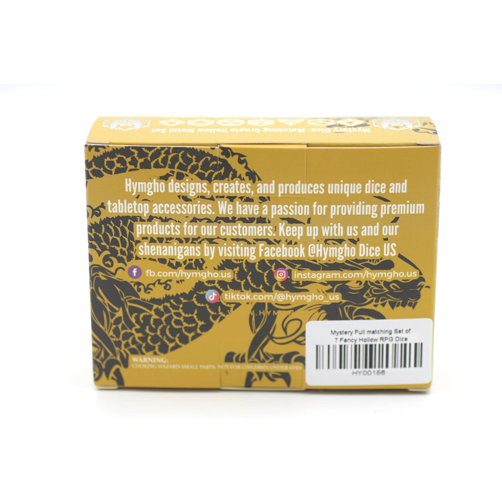 Hurry! Only3units left in stock!Contained within this box is a full matching set of seven ornate hollow metal dice. Many sets have a musical quality when rolled. Only the mightiest heroes can wield their power, but which set of Hymgho's premium dice dwells within? Will you be the adventurer to obtain this quest's reward?