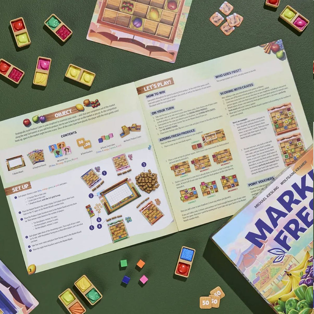 Market Fresh is a stacking, tile-placement game for 1 to 4 players. On a players turn, they take a crate from the supply or one of the available face up crates and add it to their hand. They will then choose one of their crates from their hand to place into their stall and score points accordingly.