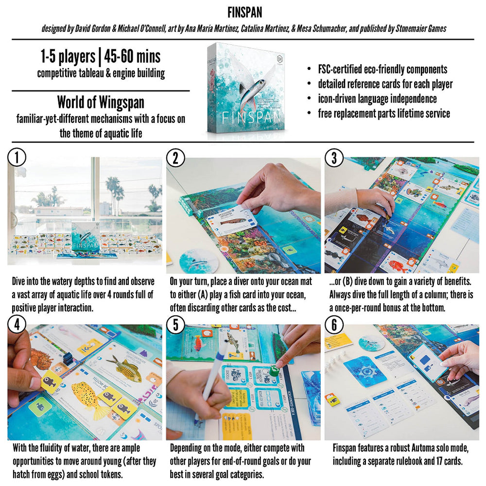 Recommended Ages: 10+The World of Wingspan just got a lot bigger with the addition of Finspan! Elizabeth Hargrave helped designers David Gordon and Michael O’Connell develop this game into something that is familiar-yet-different from Wingspan, delving deep into the fish theme.